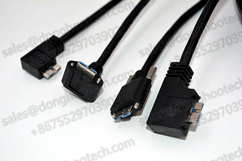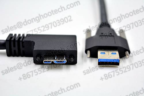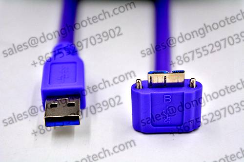 5, This sample cable is with one end connector USB3.0 a male, one end of the micro B USB3.0 angulated connector. USB3.0 Micro B the head with two sides the injection molding screw hole, the specific hole distance please inquire us. Commonly used screws for the M2 type. USB3.0 Micro B  side angled directions, with a lock screw fixation,  the angulated USB connector can solve the equipment space limitation and other issues.
